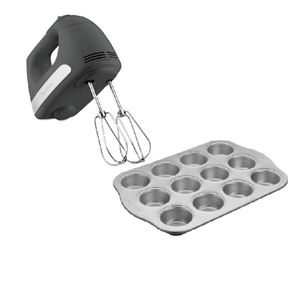 The Cuisinart Power Advantage 3-Speed Hand Mixer puts 200 watts into the palm of your hand for mixing, blending, whipping, folding, and beating ingredients into mealtime masterpieces. Three ideal speed settings mix light to heavy, starting up slow and splatter-free with the SmoothStart feature, while the center-mounted cord moves with you, keeping tangles at bay and the cord out of the way so you can mix without worry. And when you need to put the mixer down, there is a convenient heel that lets you rest it upright on the countertop. Designed for everyday baking with ease, this 12-cup muffin pan from Cuisinarts Easy Grip collection delivers evenly baked muffins, cupcakes, or bite-sized creations thanks to heavy gauge carbon steel construction. Its premium nonstick coating ensures smooth food release and effortless cleanup, while the wide, ergonomic handles offer a secure grip every time you reach for it. Whether you're prepping for brunch or packing school snacks, this pan brings comfort and performance to every recipe.