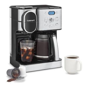 Drip or pod, hot or iced, single cup or carafe for 12get your coffee with the Cuisinart 2-in-1 Coffeemaker. This kitchen essential for coffee lovers takes home brewing to another level by combining a 12-cup carafe and single-serve options in one convenient unit. Brew a full pot 25% faster with Extreme Brew technology. Customize when and how you want your coffee with an advanced start, Brew Pause, temperature control, auto-off, and bold flavour settings. Instantly brew a single serving of hot coffee in 5-cup sizes with any pod, including Keurig K-Cup or the reusable HomeBarista filter. Or brew over ice for delicious coffee that refreshes! Experience complete brewing versatility and customizable convenience courtesy of Cuisinart!