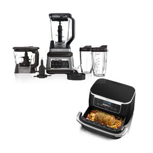 The Ninja Professional Plus Kitchen System with Auto-iQ features a new modern design and more functionality than Ninja's original Professional Kitchen System. Ninja Total Crushing Blades and Pro Extractor Blades Assembly give you perfectly crushed ice for your smoothies, frozen drinks, and nutrient extractions. The 2L Total Crushing Pitcher is great for making large batches for the whole family with 1400 peak watts of professional power. Plus, its single-serve cups with spout lids makes it easy to take delicious, nutrient-rich smoothies on the go. But don't just stop at drinksthe 1.8L processor bowl provides precision processing for even chopping, smooth purees, and up to 2 lbs. of dough. Auto-iQ Technology provides preset programs that do the work for you, no guesswork required. The Foodi FlexBasket Air Fryer with 7-qt MegaZone. Cook larger proteins or entire meals that feed your whole family all in one basket. the basket divider to cook with two 3.5 qt baskets or remove it to cook in 1 MegaZone for full 7-qt capacity. Eliminate back-to-back cooking with Dual Zone Technology. Use Smart Finish to cook 2 foods, 2 ways that finish cooking at the same time, or sync the settings across both zones with Match Cook. Plus, it features 6 cooking functions: air fry, air broil, roast, bake, reheat, dehydrate.