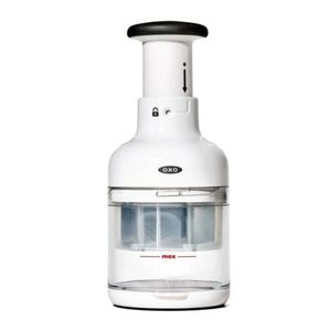 The OXO Good Grips Chopper can handle all chopping tasks much faster and safer than your chefs knife. Featuring a sharp, stainless steel blade that rotates with every single press of the knob, resulting in perfectly even pieces. Its comfortable and easy to use, and the large catcher cup has convenient measurement markings. The whole thing comes apart for cleanup.