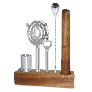 A complete 6-piece kit designed for style and function. It comes with a slim acacia wood stand that keeps your tools organized while saving space. This set includes everything you need to mix cocktails at home or entertain guests with ease.