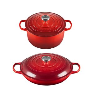 The Dutch Oven's design yields moist, tender results for slow-simmered soups and stews. This versatile kitchen staple can be used for more than just comfort foods experiment with no-knead bread or even use it to bake a cake!This high-quality pot is also commonly referred to as a Casserole or Dutch Oven. The latter term was widely adopted after the Dutch became famous for producing and exporting cookware in the 1700s. Le Creuset Enamelled Cast Iron cookware has been the world's quality benchmark for almost a century. Each piece is cast individually in sand molds and hand inspected by French artisans. The iconic cookware is beloved for both its chip-resistant enamel exterior, its tight fitting lid and superior heat retention that locks in flavour and keeps food moist and tender. The Le Creuset enameled cast iron Braiser is uniquely designed to provide steady, even heat to transform tough cuts of meat and hearty vegetables into tender, flavorful dishes. The wide base allows ingredients to be placed in a single layer for searing without crowding; once liquid is added, the domed lid circulates steam to lock in moisture and flavor. The versatile shape of the braiser also makes it perfect for shallow frying, steaming, stews, casseroles and serving at the table. Individually crafted by French artisans from the finest quality materials since 1925, Le Creuset enameled cast iron cookware is beloved for its perfected design and exceptional heat retention that produces superior results from stove to oven to table. Designed for generations of durability, the easy-to-clean porcelain enamel requires no seasoning, minimizes sticking.