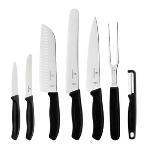 This versatile 7-piece set includes a selection of professional sharp stainless steel blades, a carving fork and a peeler each tailored for precision in every kitchen task. Lightweight, ergonomic handles provide a secure and comfortable grip during use. Swiss made and dishwasher safe, this set combines long-lasting durability with easy maintenance.
