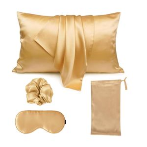 This luxurious 4-piece set features a 100% silk pillowcase, matching scrunchie, sleep mask, and drawstring pouch in a sleek gold-tone finish. Designed for a smooth, gentle touch, it helps reduce friction on hair and skin while adding an elegant, spa-like feel to your bedtime routine.
