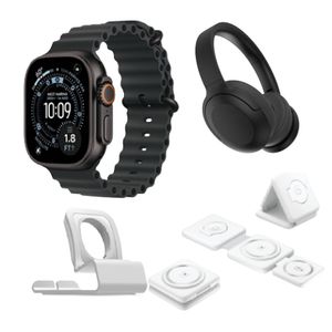 The Apple Watch Ultra 3 is Apple's toughest, most adventure-ready smartwatch yet, featuring 5G, two-way satellite messaging for off-grid communication, and a wide-angle OLED display with slimmer bezels for enhanced readabilityeven in harsh environments. With up to 42 hours of battery life (and up to 72 in low-power mode), advanced health monitoring including background hypertension detection and Sleep Score, plus rugged crash and fall detection tools, it's engineered for serious outdoors performance. The 3 in 1 folding magnetic wireless charger is a compact charging accessory that is foldable, making it highly portable and suitable for travel. Its magnetic feature ensures secure device attachment during charging and can charge a watch, a mobile phone and a pair of earphone all at the same time. The Hometech headphones deliver high-quality stereo sound while minimizing background noise: perfect for jamming out on long commutes! The long-lasting 40 hour battery, quick charging feature, and cushioned earpads ensure that these headphones will be your go-to choice for everyday wear. This sleek and compact stand is the perfect accessory to charge your Smart Watch with its practical charging cable notch.
