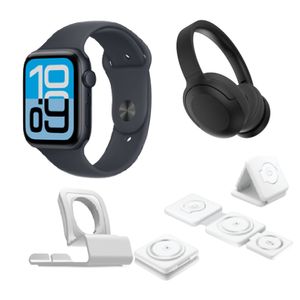 The Apple Watch SE 3 brings flagship-level performance to a budget-friendly tiernow powered by the fast S10 chip, featuring an Always-On display, gesture controls, wrist temperature sensing, sleep apnea detection, and 5G cellular support (on cellular models). It also includes fast charging with up to double the speed, and delivers up to 18 hours of battery lifeall wrapped in a durable Ion-X front glass and sleek Liquid Glass design. The 3 in 1 folding magnetic wireless charger is a compact charging accessory that is foldable, making it highly portable and suitable for travel. Its magnetic feature ensures secure device attachment during charging and can charge a watch, a mobile phone and a pair of earphone all at the same time. The Hometech headphones deliver high-quality stereo sound while minimizing background noise: perfect for jamming out on long commutes! The long-lasting 40 hour battery, quick charging feature, and cushioned earpads ensure that these headphones will be your go-to choice for everyday wear. This sleek and compact stand is the perfect accessory to charge your Smart Watch with its practical charging cable notch.