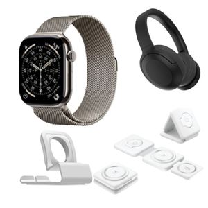 The Apple Watch Series 11 brings 5G cellular connectivity, up to 24 hours of battery life, and a display with Ion-X glass that's twice as scratch-resistant thanks to a ceramic atomic-level coating. It also introduces breakthrough health insightshypertension alerts via the optical heart sensor and a new Sleep Score featureall wrapped in Apple's thin, comfortable Liquid Glass design aesthetic. The 3 in 1 folding magnetic wireless charger is a compact charging accessory that is foldable, making it highly portable and suitable for travel. Its magnetic feature ensures secure device attachment during charging and can charge a watch, a mobile phone and a pair of earphone all at the same time. The Hometech headphones deliver high-quality stereo sound while minimizing background noise: perfect for jamming out on long commutes! The long-lasting 40 hour battery, quick charging feature, and cushioned earpads ensure that these headphones will be your go-to choice for everyday wear. This sleek and compact stand is the perfect accessory to charge your Smart Watch with its practical charging cable notch.