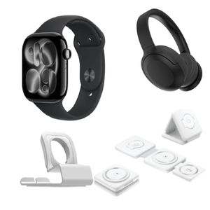The Apple Watch Series 11 brings 5G cellular connectivity, up to 24 hours of battery life, and a display with Ion-X glass that's twice as scratch-resistant thanks to a ceramic atomic-level coating. It also introduces breakthrough health insightshypertension alerts via the optical heart sensor and a new Sleep Score featureall wrapped in Apple's thin, comfortable Liquid Glass design aesthetic. The 3 in 1 folding magnetic wireless charger is a compact charging accessory that is foldable, making it highly portable and suitable for travel. Its magnetic feature ensures secure device attachment during charging and can charge a watch, a mobile phone and a pair of earphone all at the same time. The Hometech headphones deliver high-quality stereo sound while minimizing background noise: perfect for jamming out on long commutes! The long-lasting 40 hour battery, quick charging feature, and cushioned earpads ensure that these headphones will be your go-to choice for everyday wear. This sleek and compact stand is the perfect accessory to charge your Smart Watch with its practical charging cable notch.