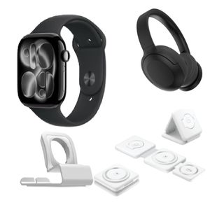 The Apple Watch Series 11 brings 5G cellular connectivity, up to 24 hours of battery life, and a display with Ion-X glass that's twice as scratch-resistant thanks to a ceramic atomic-level coating. It also introduces breakthrough health insightshypertension alerts via the optical heart sensor and a new Sleep Score featureall wrapped in Apple's thin, comfortable Liquid Glass design aesthetic. The 3 in 1 folding magnetic wireless charger is a compact charging accessory that is foldable, making it highly portable and suitable for travel. Its magnetic feature ensures secure device attachment during charging and can charge a watch, a mobile phone and a pair of earphone all at the same time. The Hometech headphones deliver high-quality stereo sound while minimizing background noise: perfect for jamming out on long commutes! The long-lasting 40 hour battery, quick charging feature, and cushioned earpads ensure that these headphones will be your go-to choice for everyday wear. This sleek and compact stand is the perfect accessory to charge your Smart Watch with its practical charging cable notch.