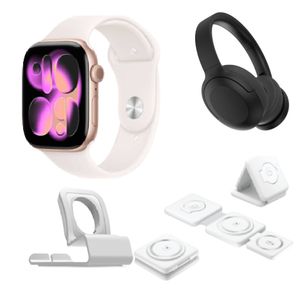 The Apple Watch Series 11 brings 5G cellular connectivity, up to 24 hours of battery life, and a display with Ion-X glass that's twice as scratch-resistant thanks to a ceramic atomic-level coating. It also introduces breakthrough health insightshypertension alerts via the optical heart sensor and a new Sleep Score featureall wrapped in Apple's thin, comfortable Liquid Glass design aesthetic. The 3 in 1 folding magnetic wireless charger is a compact charging accessory that is foldable, making it highly portable and suitable for travel. Its magnetic feature ensures secure device attachment during charging and can charge a watch, a mobile phone and a pair of earphone all at the same time. The Hometech headphones deliver high-quality stereo sound while minimizing background noise: perfect for jamming out on long commutes! The long-lasting 40 hour battery, quick charging feature, and cushioned earpads ensure that these headphones will be your go-to choice for everyday wear. This sleek and compact stand is the perfect accessory to charge your Smart Watch with its practical charging cable notch.