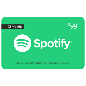 Redeemable only for full price standalone Premium subscription months via spotify.com and cannot be redeemed for discounted or group subscriptions. Not applicable to Residents of Quebec: Cannot be redeemed for cash or credit and cannot be returned or resold (except where required by law). You must have or register for a Spotify account and you must be 13+ and reside in the country of purchase. Single-use; the full face-value for an individual account is deducted at redemption and no incremental redemption is permitted. Spotify is not responsible for any loss or damage resulting from lost, stolen, or unauthorised use. Full terms apply, visit www.spotify.com/gift-card. Provided by Spotify AB, registration number 556786-5729.